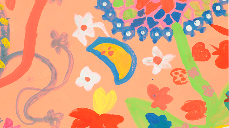 たねと花がつながっていて、たねのまん中で色がまざっていたので、花びらの色をレモン色、きみどり、ピンク、水色をあわせたやさしい色でかきました。