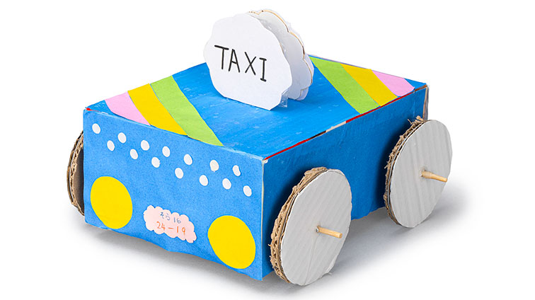 はじめはあまりイメージができていなくて、あざやかな青色の折り紙をぺたぺたはっていました。すると、なんだかタクシーに見えてきて、これはタクシーにしようと思いました。空のイメージを出すために、雲や雪、にじなどのもようがあります。そしてナンバープレートは24-19(にじいく)そら16(そらいろ)にしています!