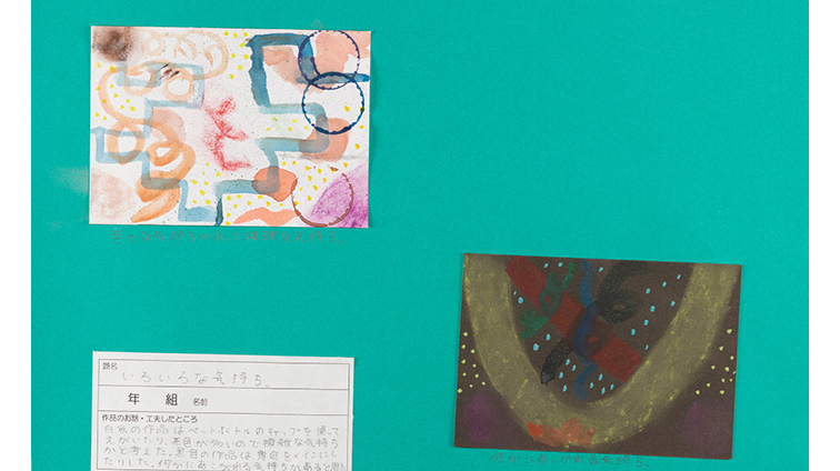 この作品は、自分のいろいろな感情を表しています。楽しさを明るく、悲しみを少し暗めに仕上げました。また、色のぬり方を工夫したり、自分の気持ちのままに作品をつくりました。