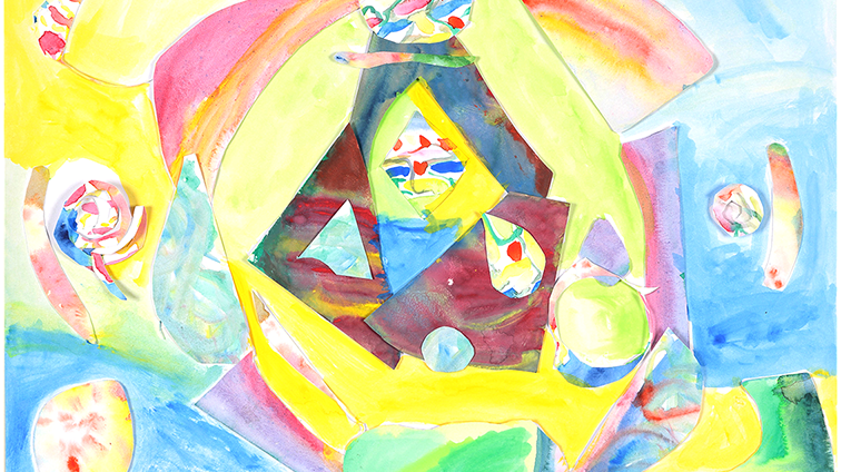 これは、私のふくざつな心の中を表しています。学校で楽しいことがあったり、悲しいことがあったり、さびしいことがあったり...。いろいろな感情が私の中にありますが、それでも、私の心の中は一つにつながっています。心の中をいろいろな色で表現しました。