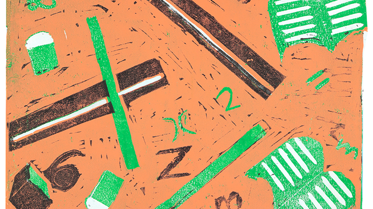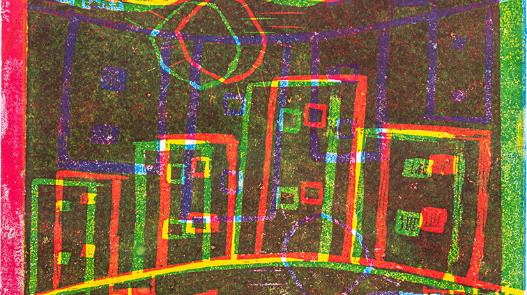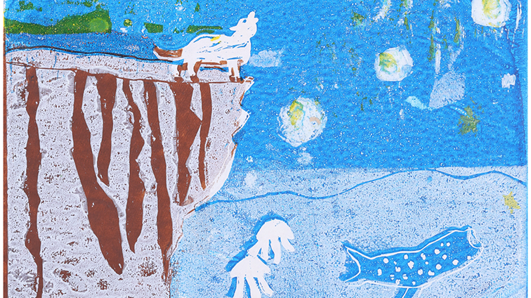 色重ねが難しかったけど、上手に刷れたのでよかったです。何を表現しているかを想像し、どんな気持ちになったかを考えてほしいです。一枚の絵の一部がズレているのは、「わざと」です。なぜだと思いますか?