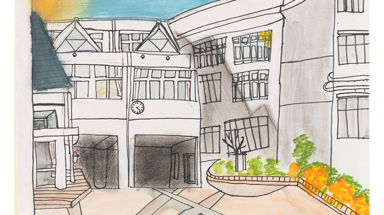 中庭のキレイな景色をかきました。窓ガラスや草の描き方を工夫しました。6年間の思いを込めて描きました。