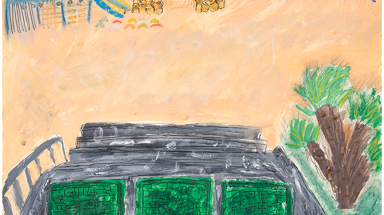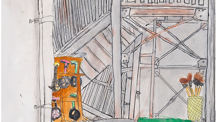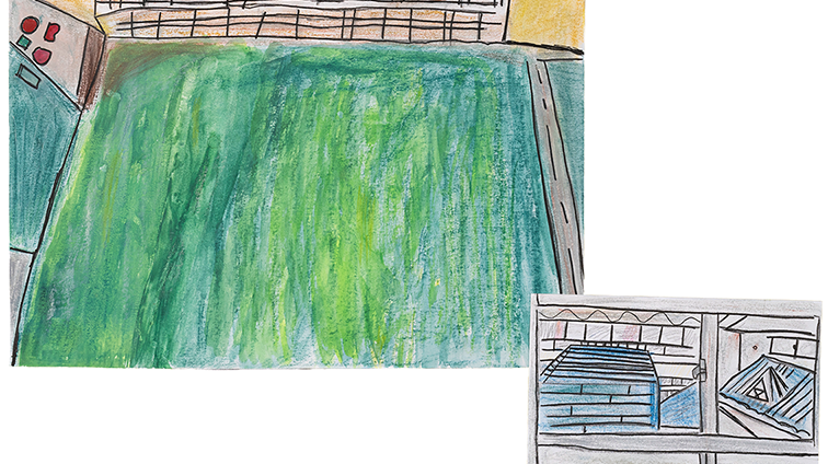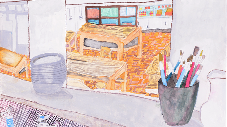 コンクリートのところを水を少なくしたベタベタの絵の具を使い、くっきりと表しました。物の表現をぼんやりさせることで、思い出しているようにしました。