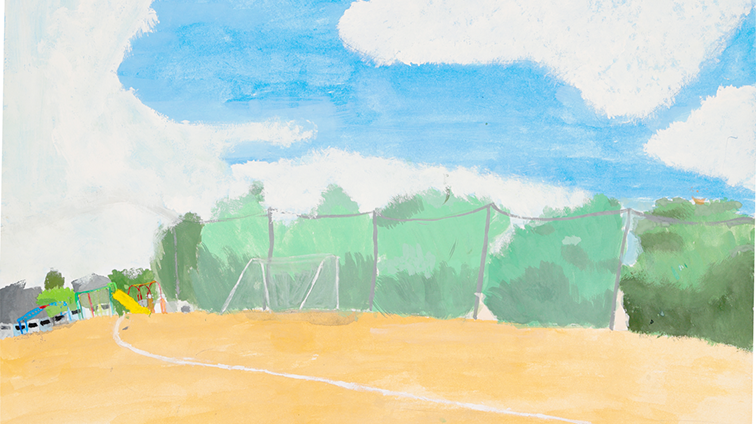 運動場の砂と空の水色があるのをイメージして色を少しかえたり、光がさしてるから明るめの色をつかった。