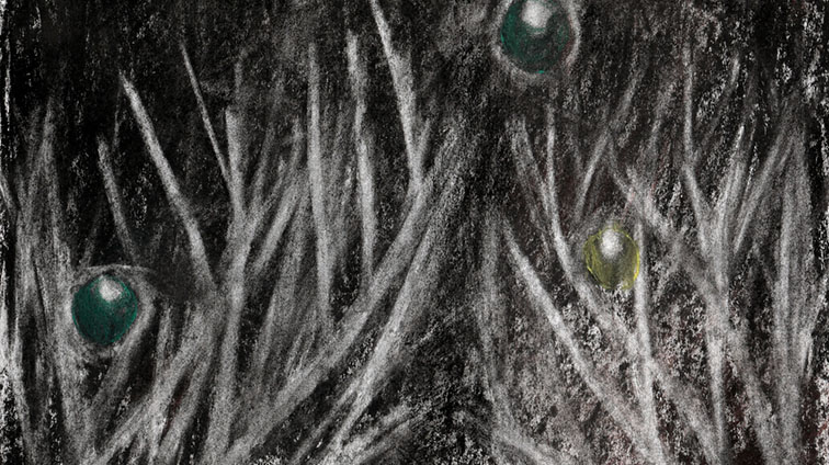 夜に光るホタルをあらわしたかったので、黄色や緑のめだつ色でホタルを描きました。消したり描いたりして、ある部分だけを光っているようにあらわしました。