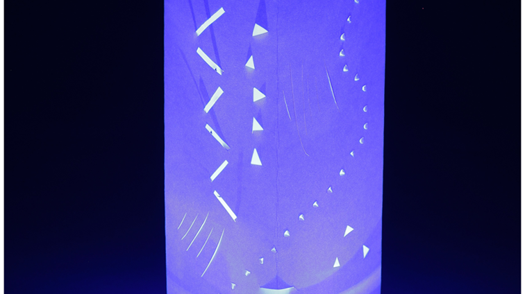 シナベニヤ板(版木を再利用したもの)・枝・和紙・スタッフ・テープ/18×23×15cm/東京都
