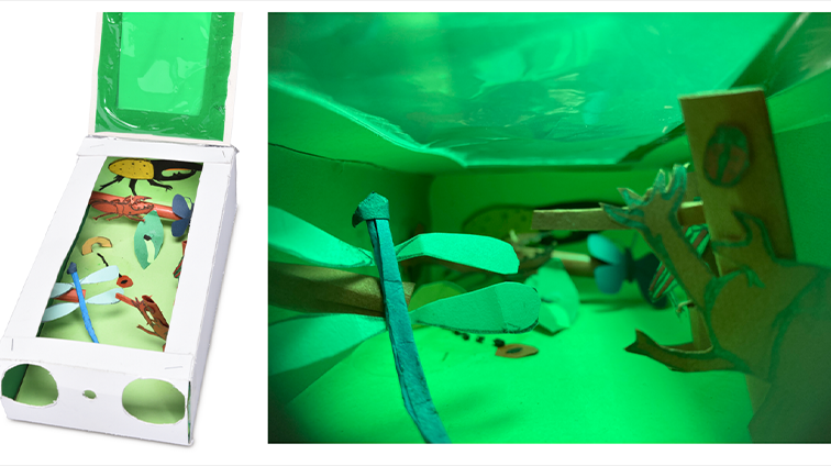 段ボール箱・色セロハン・紙粘土・アルミホイル・たこ糸・小石・貝がらなど/11×22×30cm/埼玉県